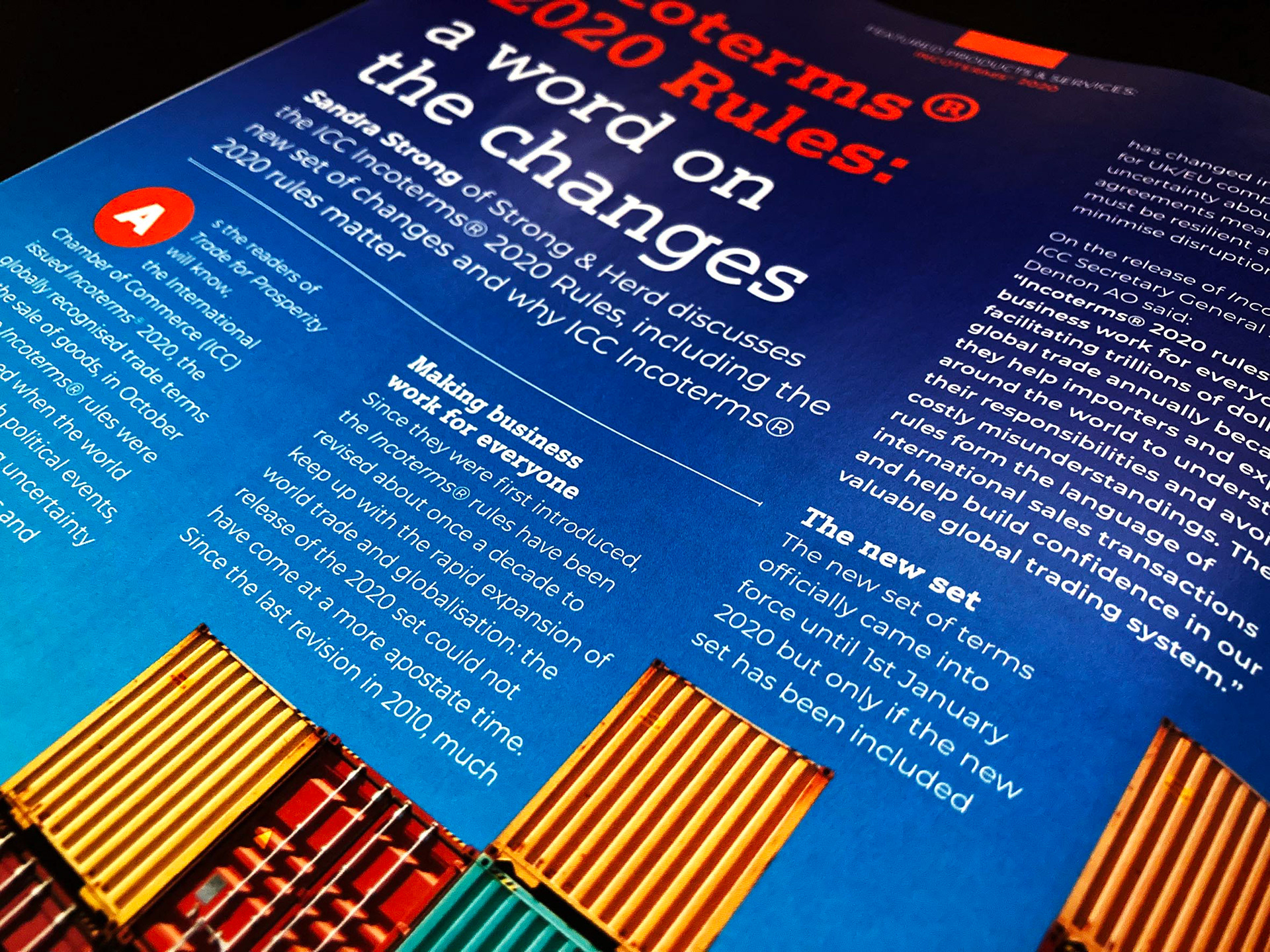 A bi-annual project created on behalf of the International Chamber of Commerce focussing on International Trade. The project involves Design, Art Direction and production across a Printed and Digital publication, Website and Video content. Some of the tasks which are covered on this project include: Assessing the target audience and creating the correct tone, design and feel of the publication and website, working closely with the client to ensure the right end result was reached, taking the project from concept to completion, picture research, laying out pages, commissioning of illustration and info-graphic generation.